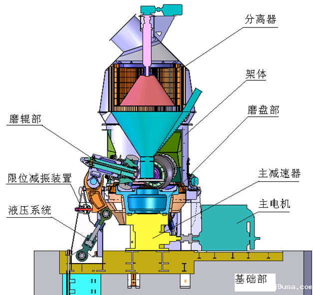 雷蒙磨粉机主要由:主机、分析器、风机、成品旋风分离器、微粉旋风分离器及风管组成。其中,主机又由:机架、进风蜗壳、铲刀、磨辊、磨环、罩壳等配件组成。