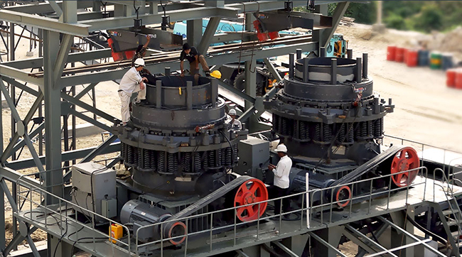 将符合粒度要求的矿料通过给料机喂入粗碎机,粗碎机将大块石料一次破碎成中等粒度,然后用筛分设备进行筛分,合格的矿料送去细碎,不合格的矿料再进行粗碎。 并且细碎的矿石材料将通过输送机给料机被送到细碎机或冲击式细碎机。细碎机可以将矿石材料加工成更小的粒度,这通常可以满足成品粒度的要求。 如果需要更精细的成品,可以配置超细细碎机。细粉碎后,送至筛选机进行筛分处理。筛选合格的送成品仓库储存,不合格的再次细碎直至合格。