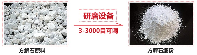 我们把方解石大块物料经破碎机破碎到能进入磨粉机的入料细度(15mm-50mm),经过破碎后的方解石小块物料经提升机送至料仓,再经振动给料机将其均匀定量的送入磨机研磨室内进行研磨。